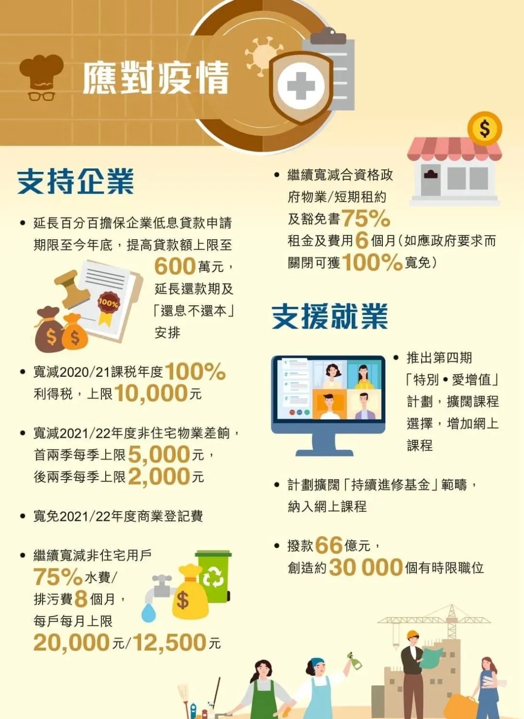 — 繼續(xù)寬減非住宅用戶75%水費/排污費8個月,每戶每月上限20,000元/12,500元;