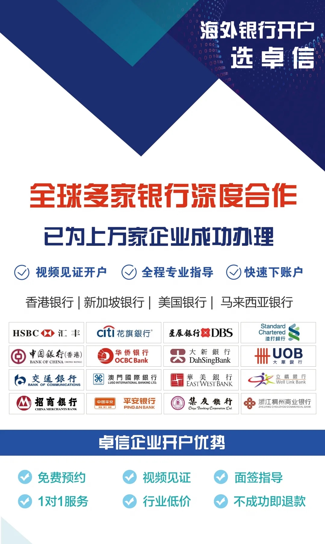 卓信擁有多年開戶經(jīng)驗,與多家銀行有良好合作關(guān)系,為客戶提供免費開戶預(yù)約服務(wù),國內(nèi)視頻見證開戶,全程保駕護航,歡迎隨時聯(lián)系!