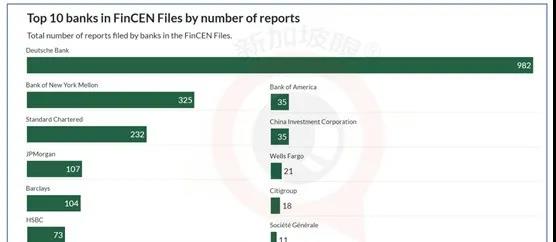 “可疑交易”份數(shù)最高的10家銀行依此為:德意志銀行、紐約梅隆銀行、渣打銀行、摩根大通、巴克萊銀行、匯豐銀行、美國銀行、中國投資有限責(zé)任公司、美國富國銀行、花旗集體、法國興業(yè)銀行。