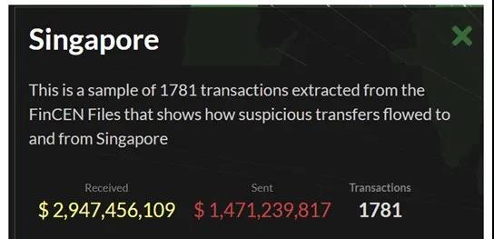 同時(shí),文件顯示有1781宗“可疑交易”與新加坡有關(guān),有超過29億美元流入新加坡,將近15億美元從新加坡流出。
