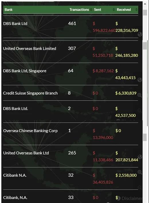 這批文件也顯示,其間共有1781宗“可疑交易”流經(jīng)新加坡,流入新加坡的資金總額為29億4746萬美元,從新加坡流出的資金有14億7124萬美元。