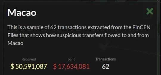 文件顯示有62宗“可疑交易”與澳門特區(qū)有關(guān),有超過5000萬美元流入香港,1763萬美元從澳門流出。