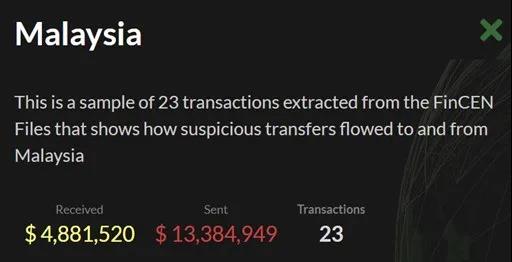 文件顯示有23宗“可疑交易”與馬來西亞有關(guān),有488萬美元流入大馬,1338萬美元從大馬流出。