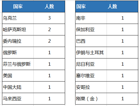 這20人絕大多數(shù)出現(xiàn)在發(fā)展中國家,烏克蘭名列榜首,有3人;其次是哈薩克斯坦、委內(nèi)瑞拉、俄羅斯,各有2人。