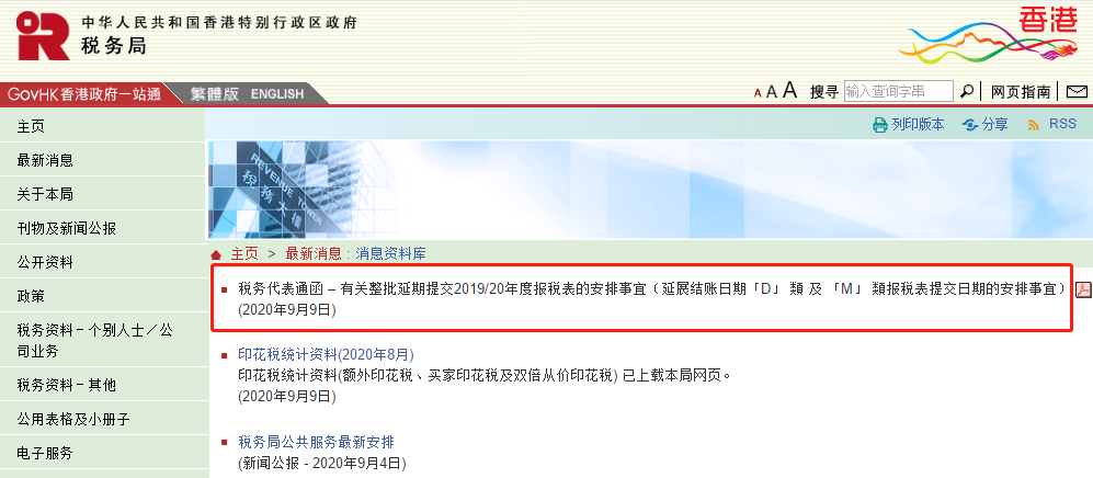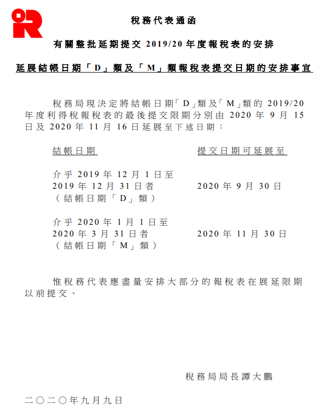 9月9日,香港稅務(wù)局發(fā)出關(guān)于《有關(guān)整批延期提交2019/20年度報(bào)稅表的安排》通知,稅務(wù)局決定延展結(jié)賬日期「D」類(lèi)及「M」類(lèi)報(bào)稅表提交期限,由最后提交期限的2020年9月15日改為2020年9月30日。