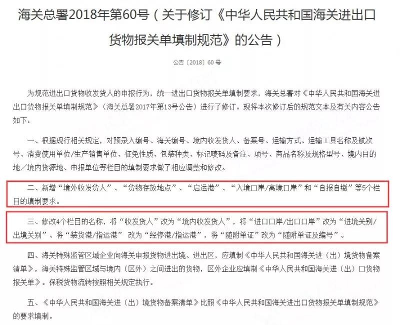 我們可以看到,在第60號公告中,最引人關(guān)注的是第二條新增“境外收發(fā)貨人”、“貨物存放地點”、“啟運港”、“入境口岸/離境口岸”和“自報自繳”等5個欄目的填制要求。