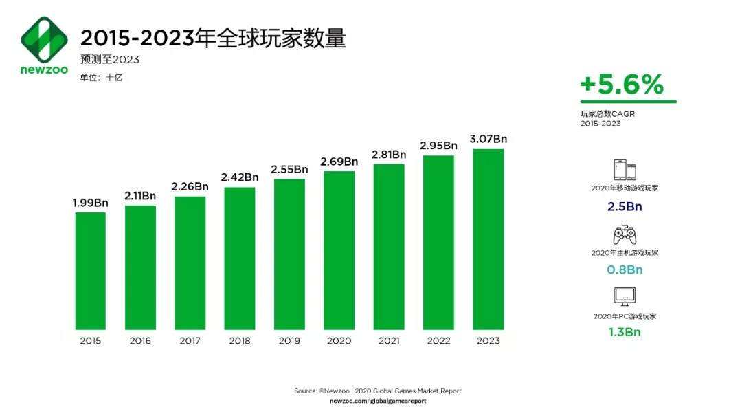 根據(jù)Newzoo最新發(fā)布的《2020年全球游戲市場報(bào)告》顯示,全球游戲市場規(guī)模將達(dá)1593億美元,同比增長9.3%;全球游戲玩家數(shù)量將持續(xù)增長,到2023年將超過30億。